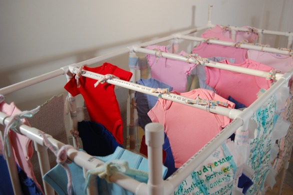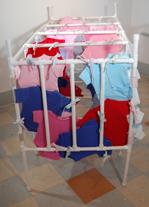 This large tunnel book is made of toxic PVC piping, to resemble a child's crib. There are pink and blue onesies representing girl and boy babies, and the hand-printed text panels on the sides speak about various toxins in a baby's environment.