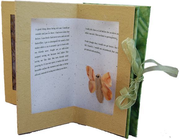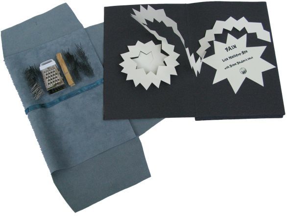 The text in this abstract pop-up book, from poet Diane Dawber's book “Lifting the Bull: Overcoming Chronic Back Pain, Fibromyalgia and Environmental Illness”, describes four kinds of pain. The pop-ups are spiky and painful looking; one of them makes a grating sound.
