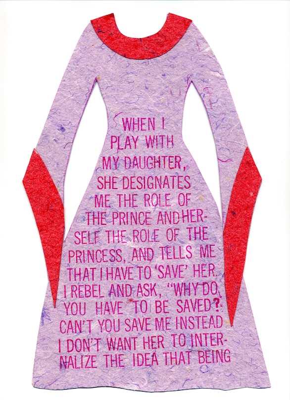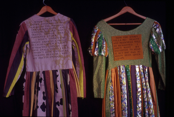 Two life-sized dresses (one raggedy house dress, and one shiny party dress) have text rubber-stamped on the bodices—Peggy Patterson's story about her reluctance to share the Cinderella story with her young daughter, because she didn't want her to get the idea that only a prince could “save” her.