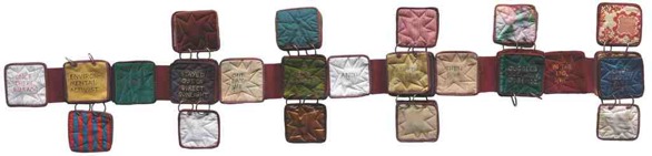 A quilted brocade “Dress-up Box” holds prince and princess clothes. Marilyn Zimmerman’s story is rubber- stamped on the five text pages, which are made of handmade paper. The “illustrations” are quilted satins and damask dresses and doublets, along with leather boots and shoes. Thanks to Brenda Belanger for the brocade and to Kim Boaro for introducing me to TIMTEX.