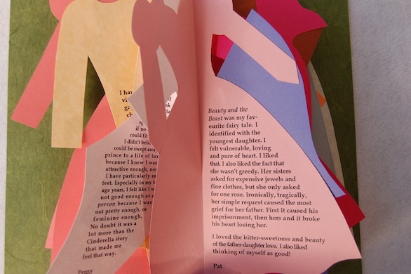 Paper pages shaped like garments and shoes carry stories about fairy tale clothing memories collected from a variety of women.