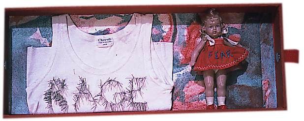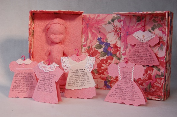 A cast-paper doll and her dresses, in a wardrobe trunk, tell a woman's poignant story about growing up believing that she was bad. The text is rubber-stamped on little handmade paper dresses, embellished with lace, ribbons and beads, and hanging on pink wire hangers. The trunk is covered with floral chintz.