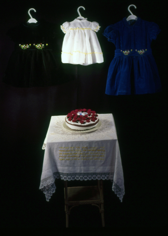 The three dresses (one original, two reproduced) my sisters and I wore for our (group) baptism hang behind a stuffed fabric Black Forest cherry cake on a small table. On a dainty tablecloth is embroidered the story of why all three of us were baptised together, in a private afternoon service. The cake is central to the story.