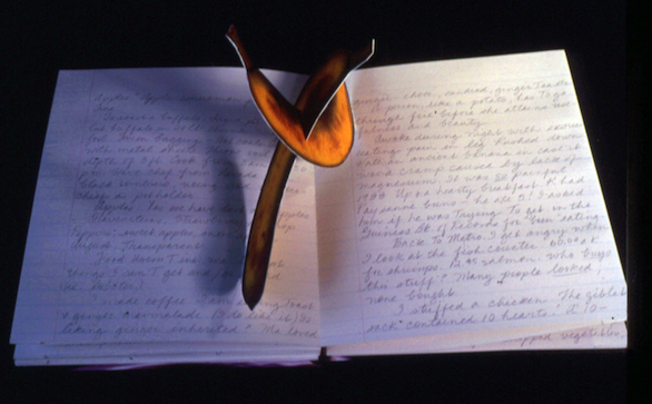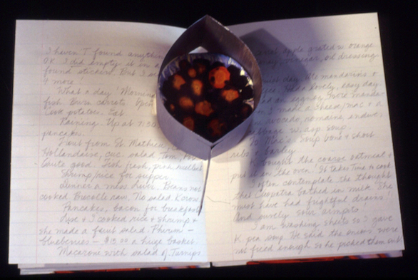 This star carousel book has photo-copies of my mother's recipe book on the covers. The rooms inside represent rooms in the house in which I grew up: the "wallpaper" is photocopies of my mother's paintings and drawings. The text is culled from her journals: the entries all concern food. My mother left 43 volumes of diaries when she died. Much was written in her own personal shorthand, a variation of the Gregg shorthand she had learned in business college, but she wrote the many food descriptions in English.