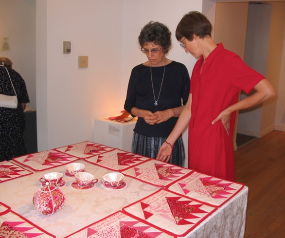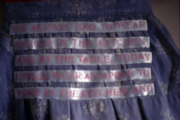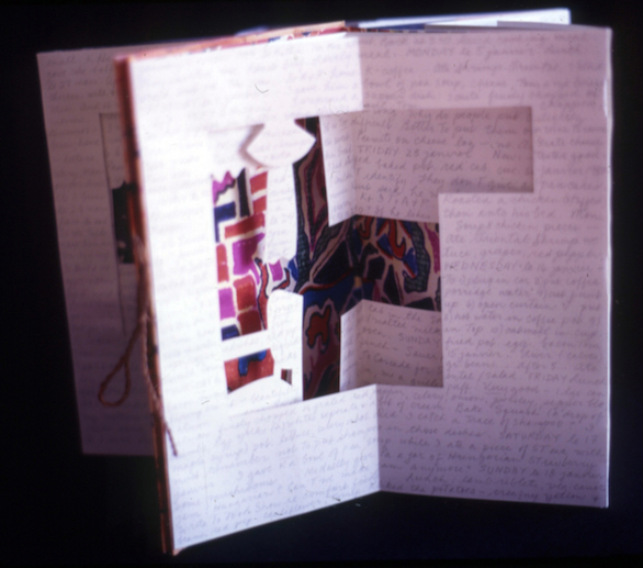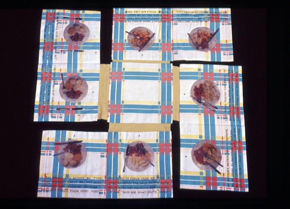 Lori Gilbert’s unpleasant memories of being forced to eat are combined with photos of a plate of food being mushed about and slowly consumed. Tablecloths have been cut, rubber-stamped, appliquéd with colour-copy transfers and re-assembled to form a fold out book.