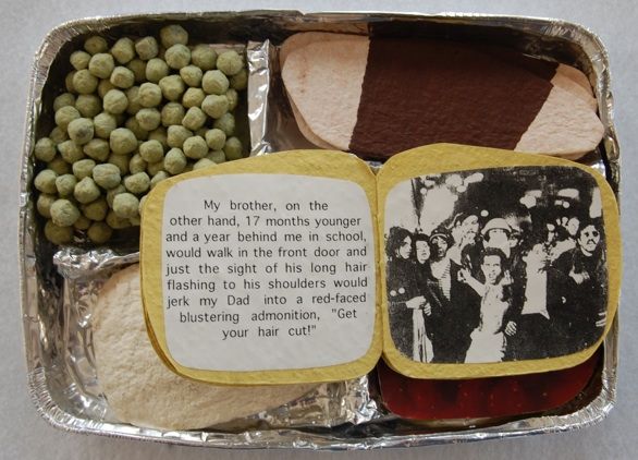 Safely nested between her parents on the couch, eating TV dinners, Marilyn Zimmerman contrasts her suburban life with the violent events on the television in 1968. An aluminum TV dinner tray hold cast paper food and a handmade paper pamphlet, all enclosed in a box. Colour and black-and-white photo-copies images are used on the box and in the pamphlet.