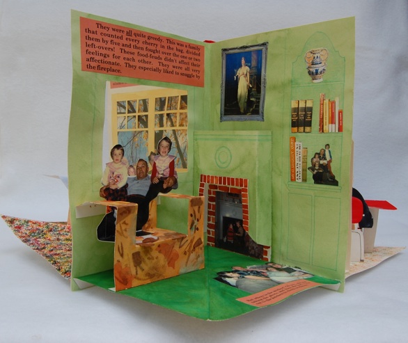 A funny story about the artist’s family’s love of food, this elaborate pop-up book centres on the rooms in which they ate in their home: kitchen, dining room, sunporch and the green room. (The father's bedroom could have been included too, because he got pancakes in bed occasionally.) Constructed of Ecohemp 89-lb. Cover, with colour-copied and watercolour images, each room has a floor with chairs and a table.