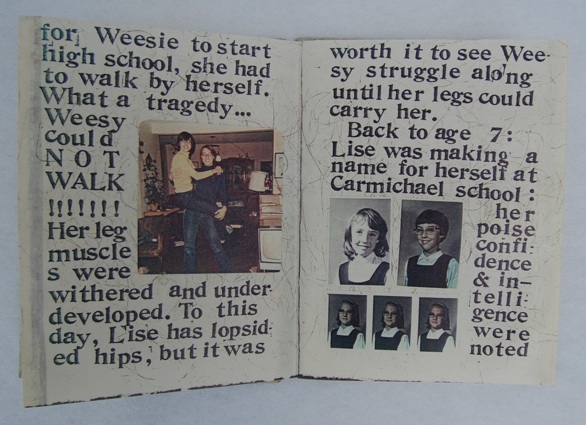 Unbeknownst to me, when I was rubber-stamping my biography, my youngest sister had decided to surprise me with her version of the story of my life, written as a radio play. It arrived in the mail the next day. I was so taken with the synchronicity, I decided to make a second book: for this I had to elicit the help of our mother, asking her to dig through boxes of family photos for specific photos, to illustrate Weesy's stories. Weesy, or Marie, as she is known to the rest of the world had a radically different perspective: that of the adorable little sister. Traditionally sewn handmade paper pages, with family photo illustrations tipped in, with hard covers.