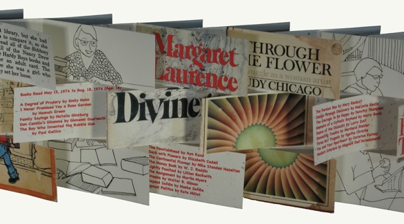 This double-sided flag book has colour images of covers of favourite books from childhood interspersed with ink drawings of me reading (even when nursing an active toddler!) The text consists of two lists: books read during a two-month period at age 17, and those read during an equivalent period at age 50, while I was artist-in-residence at Queen's University, doing research for my environment/health series. Handmade paper with text embedded made by CAVE Papers, in Minneapolis—so perfect for this commission.