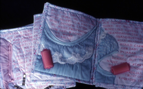 This quilted accordion is rubber-stamped with Marilyn Zimmerman's funny story about inter-generational bonding. Appliquéd with baby doll pyjamas, hair-nets and curlers, and pillowcases.