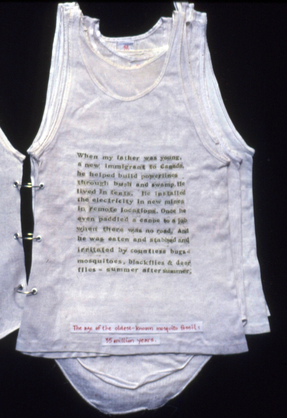 Eight of my father's singlets with photo-transferred images of him enjoying his garden, along with those of mosquitoes and blackflies. The text is rubber-stamped with a funny story about his years of working in the bush. Hand-written scientific text about "those damn flies" runs along the hems. Pages stiffened with acrylic medium hang on a clothesline, or can be ring-bound.