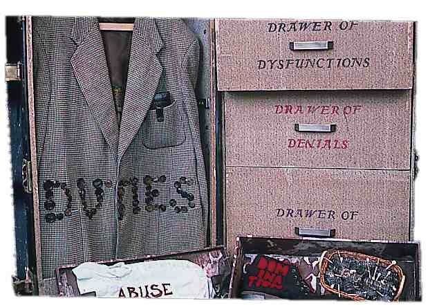 All of us carry with us emotional baggage from our families of origin. My father’s steamer trunk is full of objects with associated words rubber-stamped, embroidered and “written” with pins or buttons. The steamer trunk has a wardrobe on one side and four drawers on the other. Each drawer holds several trays; each tray holds a garment or personal items with words such as anger, responsibilities and pain.