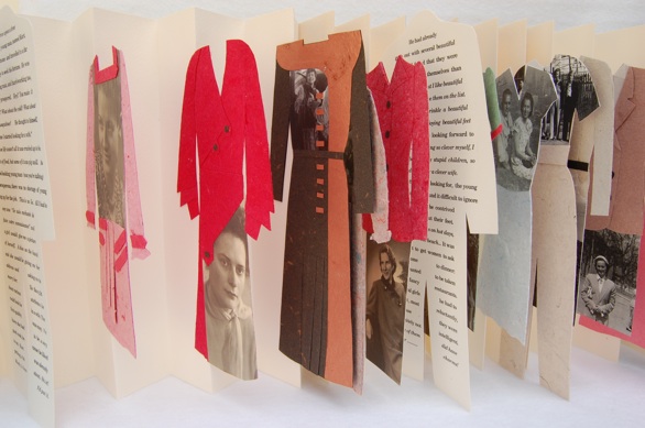 This fairy-tale-like version of my father's long quest for a wife was based on photos which he had saved in a little brown envelope, and labelled “girls I have Known.” The text pages of this flag book are hemp/cotton paper, shaped like men’s suits; the images are handmade paper women’s outfits dating from the 1920s to the 1950s, and use some of the women’s photos.