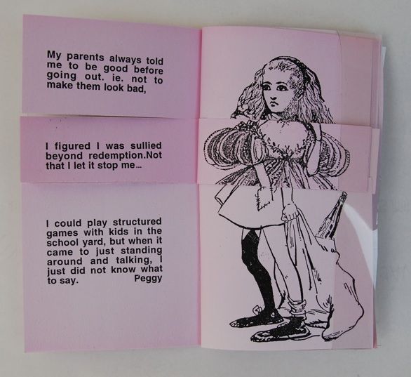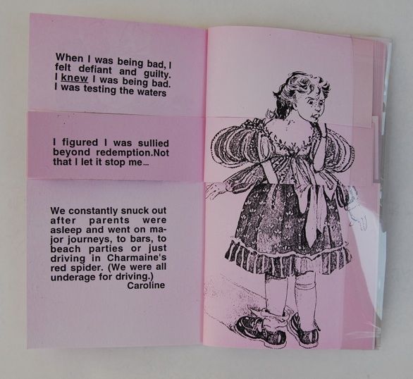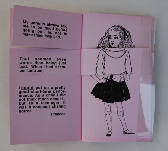 Reading the mixed-up stories about being bad or good, and seeing mixed-up story-book illustrations of good and bad girls, blurs the distinctions between the two states. This corps exquise book, with the pages trisected, is photo-copied on Rolland New Life Opaque, pre-printed pale pink. The covers are clear vinyl; it's bound with brass fasteners.