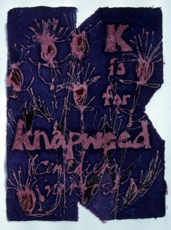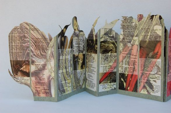 Poems by Lorna Crozier about the sex lives of vegetables are mingled with seed catalogue descriptions. The text is superimposed on colour-copies of these vegetables. The handmade paper pages are accordion-folded, cut in the shape of vegetables and enclosed in a handmade paper folding case with a garden-twine closure.