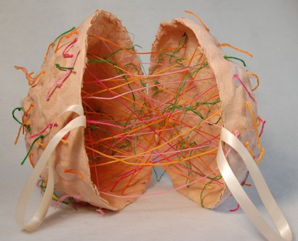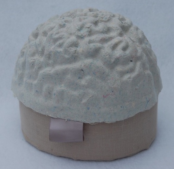 My son had a catastrophic brain injury suffering diffuse axonal injury. This book is my attempt to portray his injury visually. Paper pulp was cast in a mould for making jello for a Hallowe'en party (top) and a plaster mould made from a clay original which I sculpted myself (bottom.) I used the acetate circles to keep the threads from ripping through the paper, but realized, to my delight, that they resemble the electrodes that were attached to his head for his many EEGs.