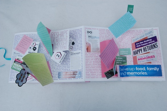 This book was created using Barbara Tetenbaum and Julie Chen's Artist's Book Ideation Cards. Using these cards is a great way to step outside the box. Instructed to use found text, I chose the title from a billboard and text from magazines. But one of the adjective cards said: Scientific or research-based, so I also consulted the library and have incorporated quotes from three books about happiness: Happy at Last, by Richard O'Connor, How We Choose to Be Happy, by Rick Foster and Greg Hines, and 14,000 things to be happy about, by Barbara Ann Kipfer. The elaborate accordion pop-up book has five spreads.>">