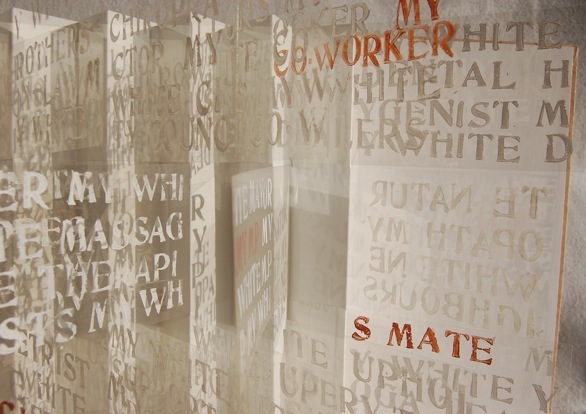 In her book "Learning to be White: Money, Race and God in America, theologian Thandeka suggests that white people play what she calls The Race Game. It has only one rule: for a week, one must preface any mention of a family member, colleague, friend etc. of European descent with the term "white." From this came the idea for this flag book which lists, alphabetically, everyone within my sphere. The few people who are NOT of European descent are printed in a pale brown, everyone else is printed in white on the acetate flags.