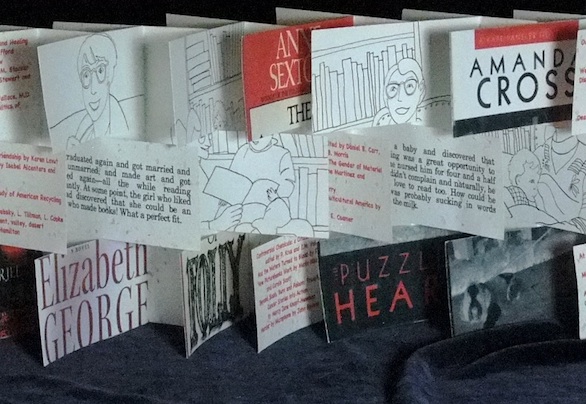The text comprises two lists of books read: on the front is a list from the summer I was eighteen, the second from the fall of 2006, when I was artist in residence in Queen's University's Department of Women's Studies, doing research about our health and the environment. The images are India ink drawings of me reading, interspersed with covers of books I have enjoyed: again, on the front one will find books from my childhood, on the back, books I read as an adult.