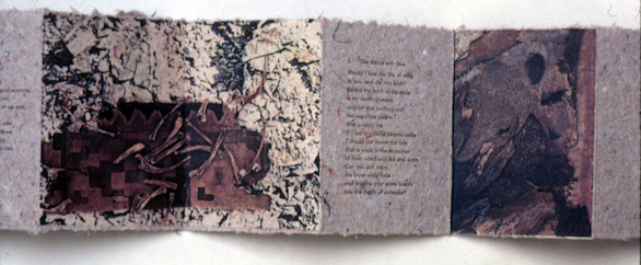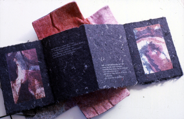 This accordion book was a collaboration with poet H. David Montgomery, with my handmade paper and photocopied images, tipped in. Letter-press printed in gold at Wayne State University.