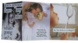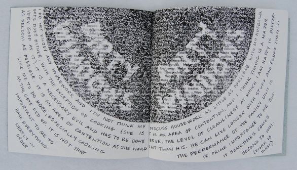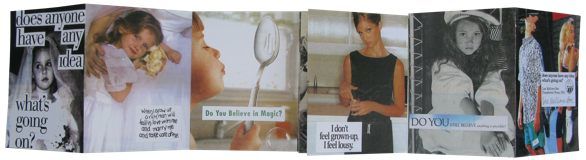 Statements and questions lead to answers which lead to more questions about women's sexual relationships as presented in women's fashion magazines. This accordion-fold book with collaged text and images was colour-copied on hemp-cotton-flax cardstock.