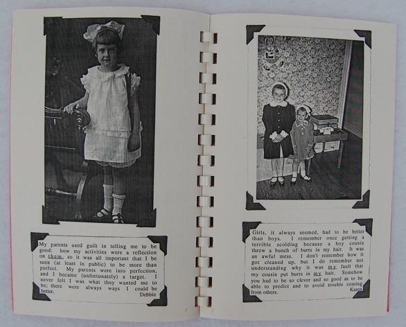 Photos of four generations of good little girls from my own family are paired with other women's stories about being good, or their parents’ expectations of goodness. Handmade paper covers enclose Kutatani end-papers and hemp-cereal straw text pages, which have been photocopied in black and white. There is a plastic comb binding.