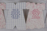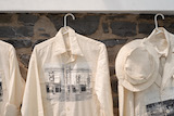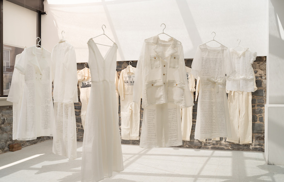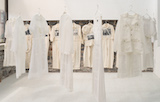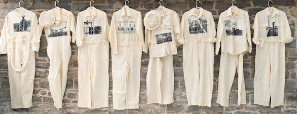 Sixteen life-sized replicas of clothing which the artist's mother and father wore during their lives. Pauline's sheer nylon dresses range from a six-year-old's party dress to her air-force uniform to a two-piece dress she had in her wardrobe when she died. Each garment has a sheer panel inside it with rubber-stamped text from her journals. Kurt was a lot older than Pauline, so his first garment is the lineman's outfit he wore on his first job. All his garments are work clothes, as that was the centre of his life. Each garment has a work-related photo on the chest. (See “Home/bodies” on the Essays page.) Her poignant text about her frustrations at not being able to create are juxtaposed with the mute but powerful photos of what he accomplished.