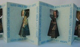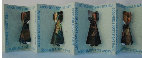 Sunbonnet Sue pop-ups, with the Virgin Mary superimposed on them, are surrounded by rules for good girls, such as “Good girls don’t fight back” and “Good girls don’t whine.” Rubber-stamped text and colour-copy transfers on handmade linen paper, which is accordion-folded with a self-cover.