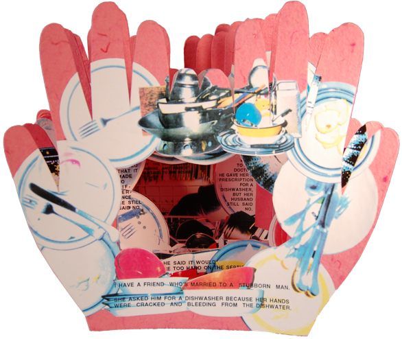 This story about a woman who wants a dishwasher, but whose husband won’t let her buy one, even with a prescription from her doctor, and money from his parents, was told to me by Danielle Hart. It’s a tunnel book made of pink handmade paper hands with colour-copied images of dirty dishes, washed dishes in a drainer and a dishwasher at the end of the tunnel.