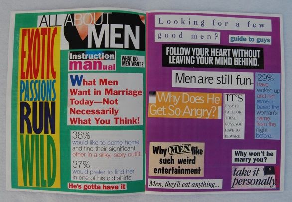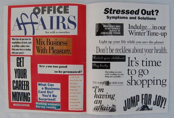 Women’s magazines are chock-full of advice—this handy volume wastes no space on articles but gives you nothing but advice on everything from “Eight things never to say to the man you love” to “Ten ways to make yourself miserable”. The pamphlet was photocopied both in colour and black and white, on Domtar Plainfield Offset paper, and stapled like a magazine.