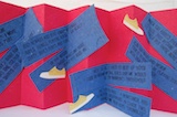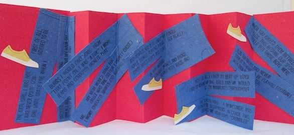 Christine Charette’s story about beating up boys in Grade Two is rubber-stamped on miniature blue jeans, which tumble across the accordion spine with tiny running shoes kicking here and there. This is a handmade paper flag book with a hard cover.