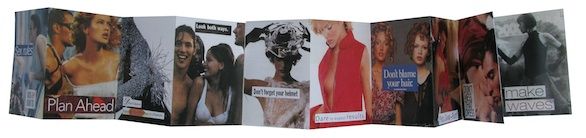 Illustrations from fashion magazines are paired with strange commands to create a bizarre little rule book for sex in the new millenium. The book is accordion folded with collaged text and images, colour-copied on hemp-cotton-flax cardstock.