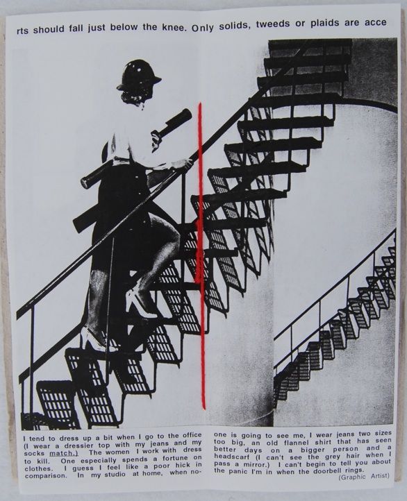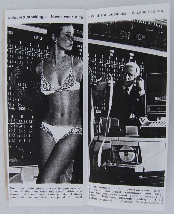 What should women wear to work? The texts include rules from a dress-for-success book and stories from professional women humourously juxtaposed with fashion editors’ suggestions (images from fashion magazines). The pamphlet is photocopied in black and white on Rolland Alkaline/Acid-free Offset, and is hand-sewn into a handmade paper cover. (See Creative Meaning-Making on the ESSAYS page for an image of page one.)