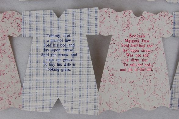 Here is a nursery rhyme book with a difference! This accordion compares nursery rhymes about girls to those about boys, drawing attention to how sexist they are. The die-cut pages, which are shaped like dresses and shirts-with-shorts, are offset-printed in pink and blue on Exeter pH-neutral paper.